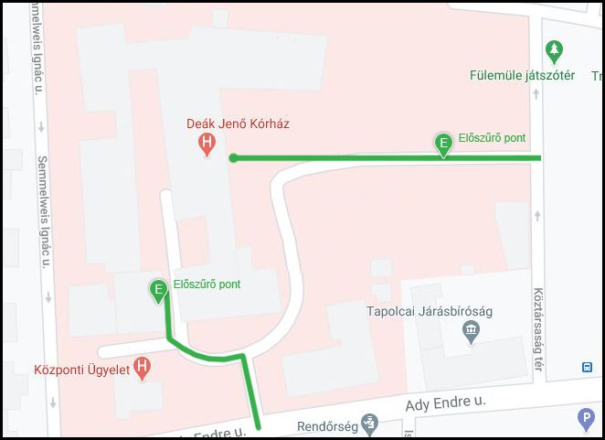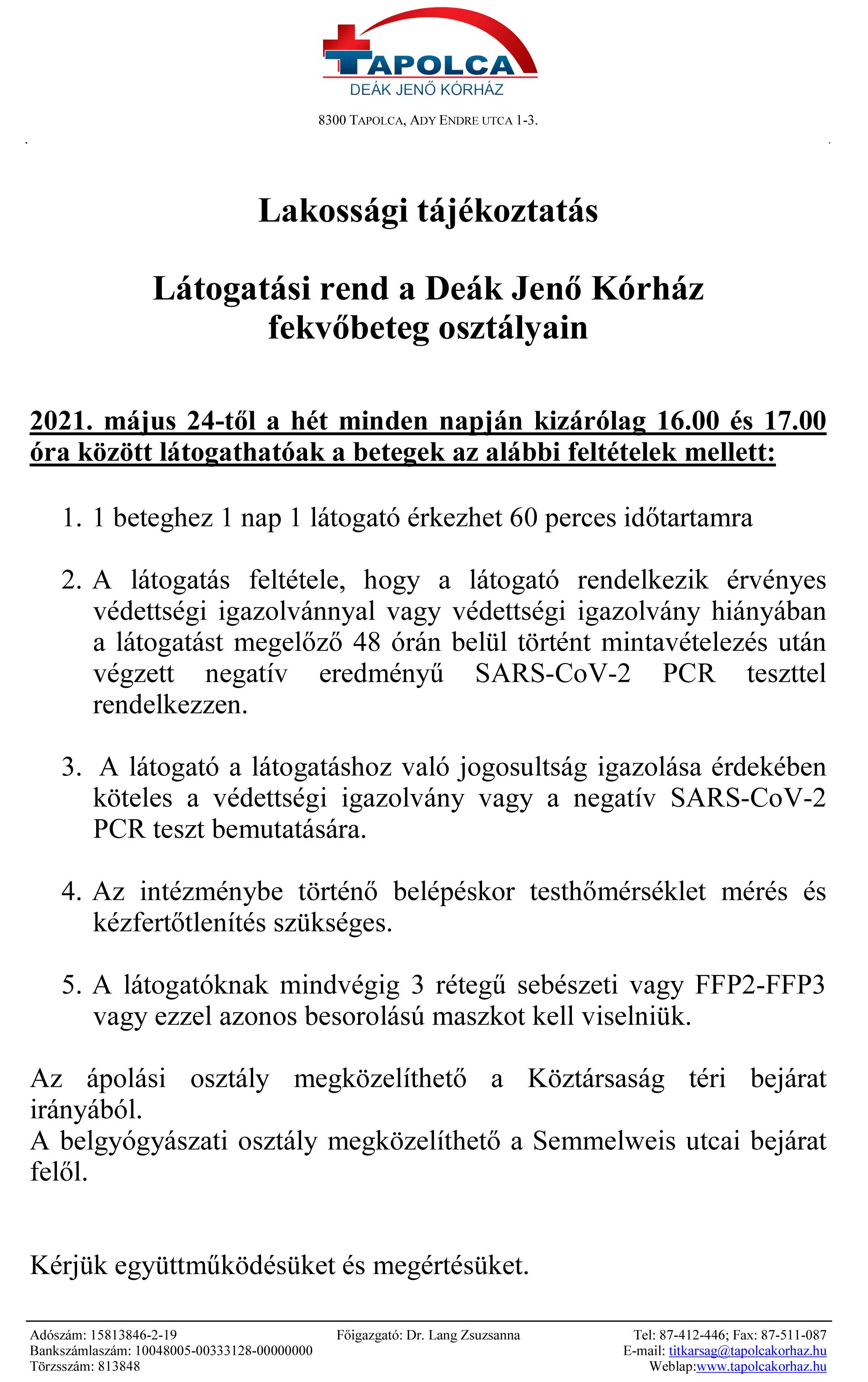 Látogatási rend a Deák Jenő Kórház fekvőbeteg osztályain 2022.március 05-től a hét minden napján kizárólag 15.00-16.00 óra között látogathatóak a betegek az alábbi feltételek mellett: 1. egy beteghez naponta legfeljebb két látogató mehet be, személyenként maximum 30 perces időtartamra, vagy egy látogató maximum 60 perces időtartamra 3. biztosítani kell, hogy a betegek és a hozzátartozók a fertőzések terjedésének megakadályozása érdekében hozott intézkedések betartásában, végrehajtásában együttműködjenek. A látogatók számára a belépési ponton a kézfertőtlenítés biztosított. 4. Az intézmény egész területén orrot és szájat eltakaró maszk használata kötelező! Az ápolási osztály megközelíthető a Köztársaság téri bejárat irányából. A belgyógyászati osztály megközelíthető a Semmelweis utcai bejárat felől. Csomagátadásra kizárólag a látogatási idő alatt van lehetőség. Kérjük együttműködésüket és megértésüket. -