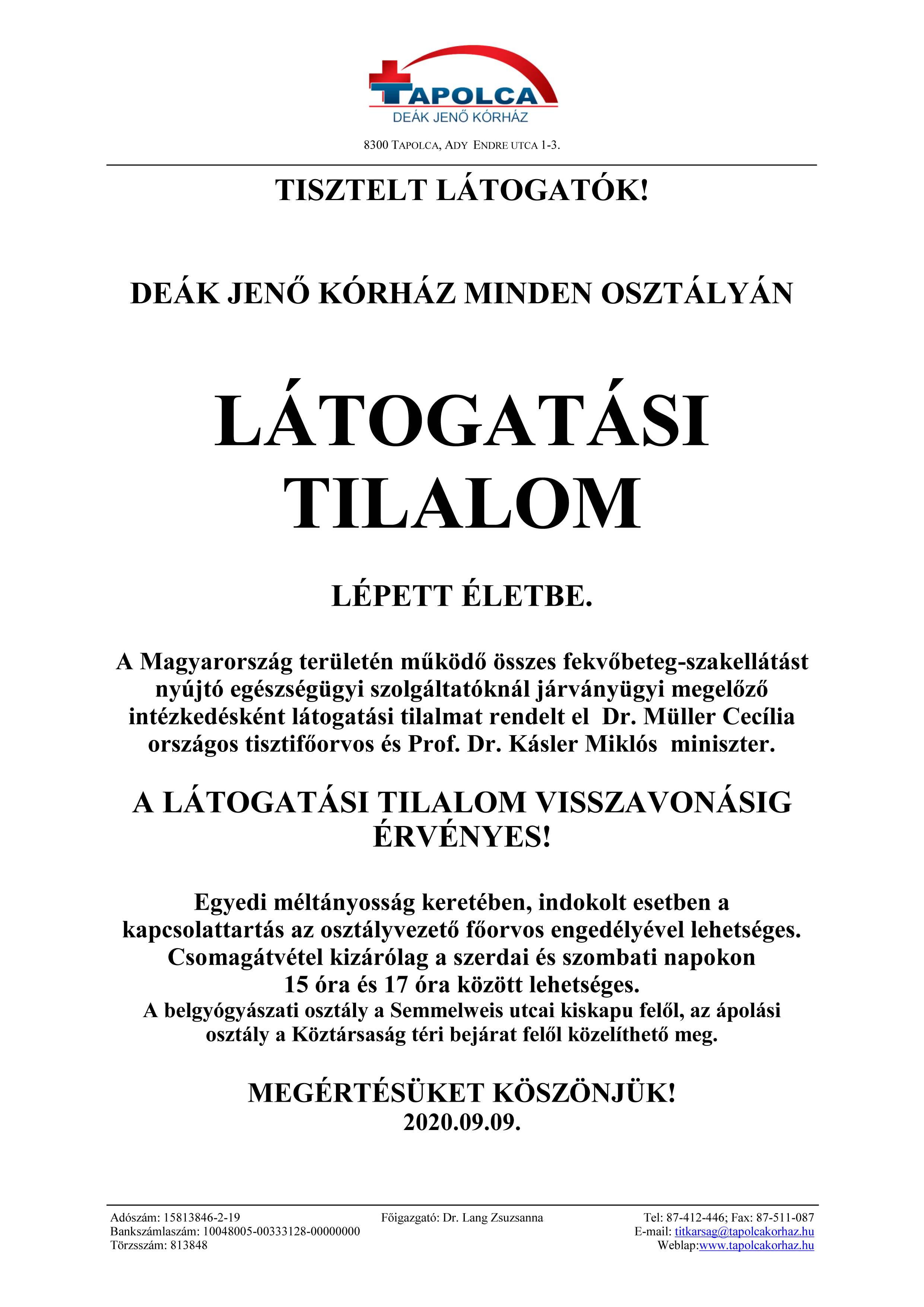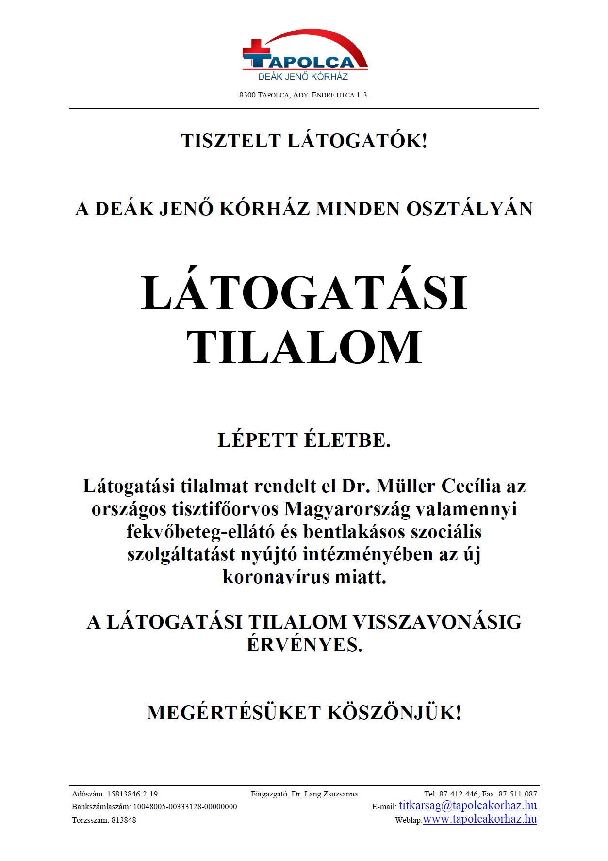 TISZTELT LÁTOGATÓK! A DEÁK JENŐ KÓRHÁZ ÁPOLÁSI OSZTÁLYÁN a COVID-19 megbetegedések miatt RÉSZLEGES LÁTOGATÁSI TILALOM LÉPETT ÉLETBE A LÁTOGATÁSI TILALOM VISSZAVONÁSIG ÉRVÉNYES! Egyedi méltányosság keretében – kockázatbecslést követően – az osztályvezető főorvos mérlegelheti a kapcsolattartás lehetőségét és indokolt esetben engedélyezheti azt. (Hivatkozott jogszabály: 1997. évi CLIV. törvény 11§ (3)-(6) bekezdése) Felhívjuk a látogatók figyelmét, hogy az intézményben kötelező a megfelelő védőfelszerelés, vagyis az orr-szájmaszk használata, a belépéskor pedig kötelező a kézfertőtlenítés! Csomagátvétel kizárólag 15 óra és 16 óra között lehetséges. MEGÉRTÉSÜKET KÖSZÖNJÜK!